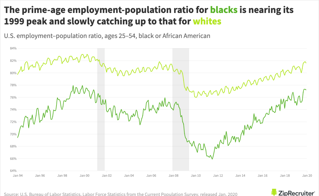 The unemployment rate for blacks (5.9% according to the most recent data from December 2019) is still far higher than that for whites (just 3.2%). Full-time white workers earn $376 per week, on average; blacks about 22% less at just $294. Even among workers under the age of 55 who have lived their entire lives in a post-Civil Rights Act era, a full 86% said in ZipRecruiter’s recent diversity survey that they had experienced racial discrimination in the workplace.