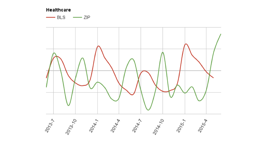 Two months after overall Healthcare employment hit 15 million jobs nationwide, hiring demand continued to grow, at a slightly slower but still healthy pace. With 22.8 million Americans joining the ranks of the insured since the implementation of the Affordable Care Act, demand for new workers to draw blood, update charts, and administer meds has spiked, a trend that seems likely to continue now that the Supreme Court ruled in favor of the Affordable Care Acts in their recent King v. Burwell decision. If that happens, an extended hiring slowdown is likely, with job losses a real possibility. For now, though, healthcare remains a key growth segment for the economy.