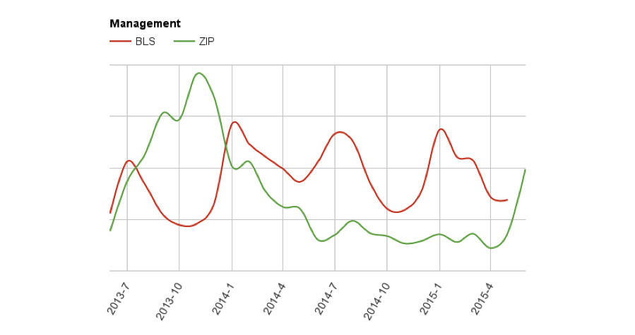 Management hiring has been on an overall downturn since January, after experiencing a year-end ramp up which left it near a two year high. Overall job creation in the sector on a normalized basis has been decent: despite the widespread media attention given to the hollowing out of the middle-class, at the managerial level, at least, the middle is a pretty good place to be.
