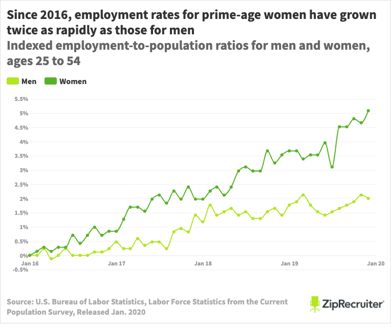 The employment-to-population ratio for women, aged 25 to 54, has seen a spectacular increase since 2015. The result is that women now hold more payroll jobs than men for the first time since the Great Recession, when traditionally male-dominated occupations like manufacturing took the hardest hit.