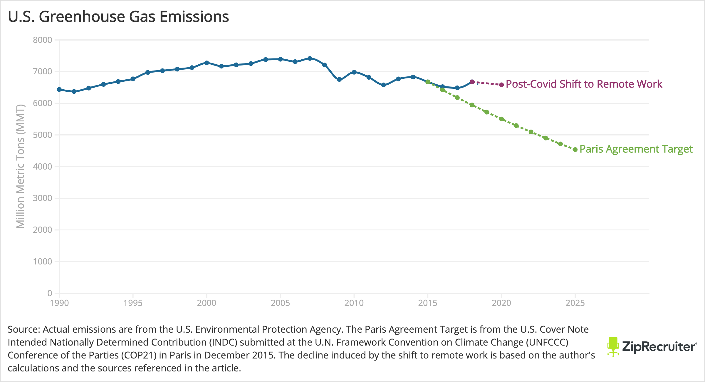 To fall within the target range, the U.S. would need to cut annual emissions by 2,140 million metric tons in the next five years—a reduction 23 times larger than that produced by the dramatic shift to remote work.