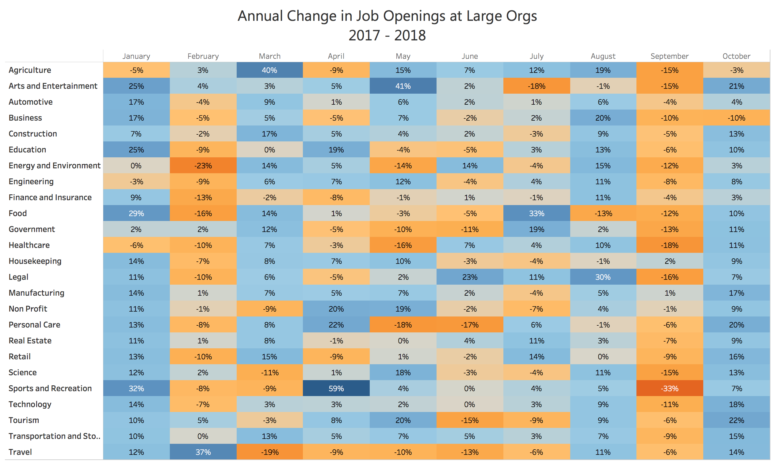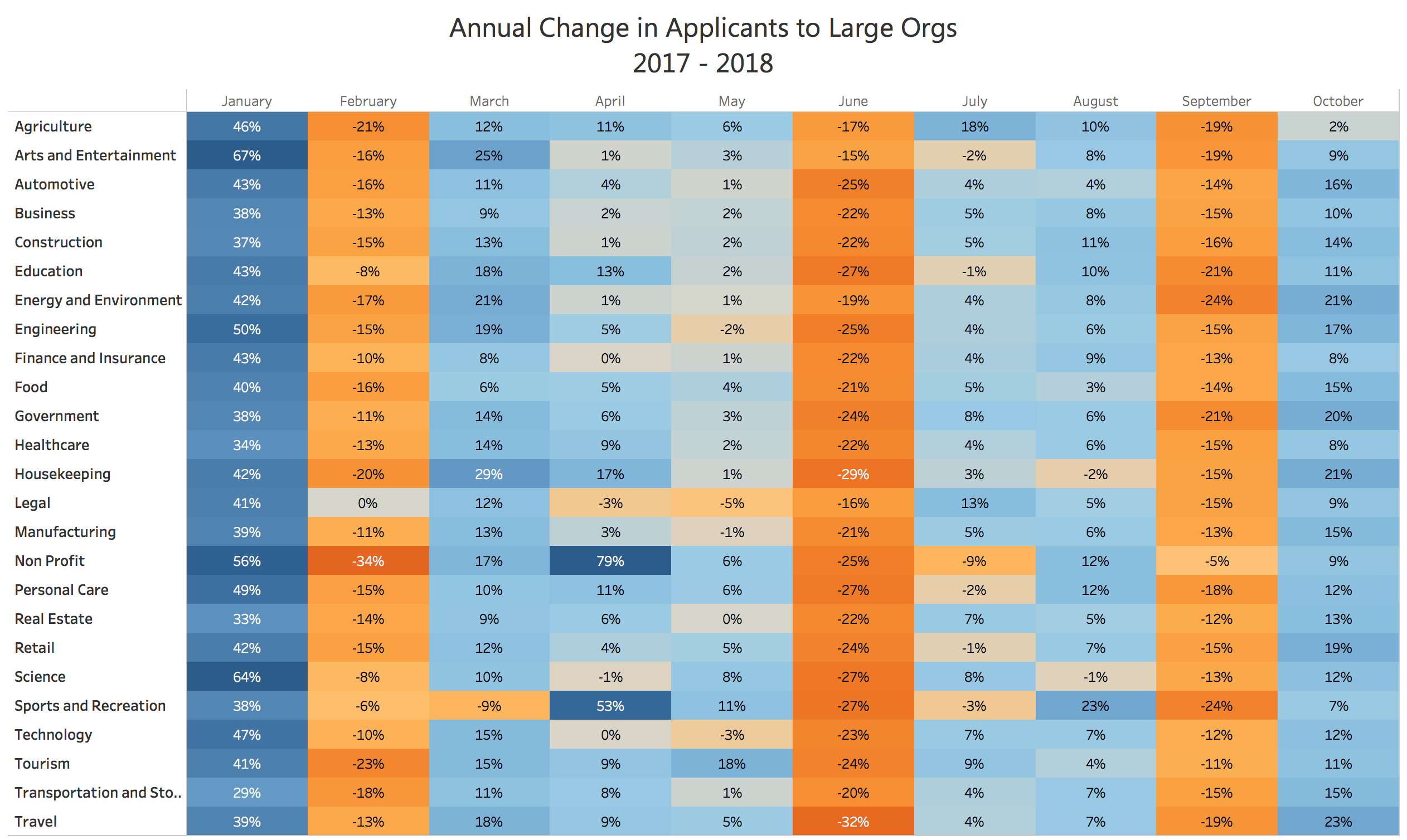 Methodology: We used ZipRecruiter data on job applicants and openings by industry going back to January 2017 to calculate year-over-year growth for each month throughout 2018. Large organizations are defined as having 500 or more employees, and small and medium businesses (SMBs) are defined as those having fewer than 500 employees. Highlight tables were created using Tableau Public and can be viewed in full format here.