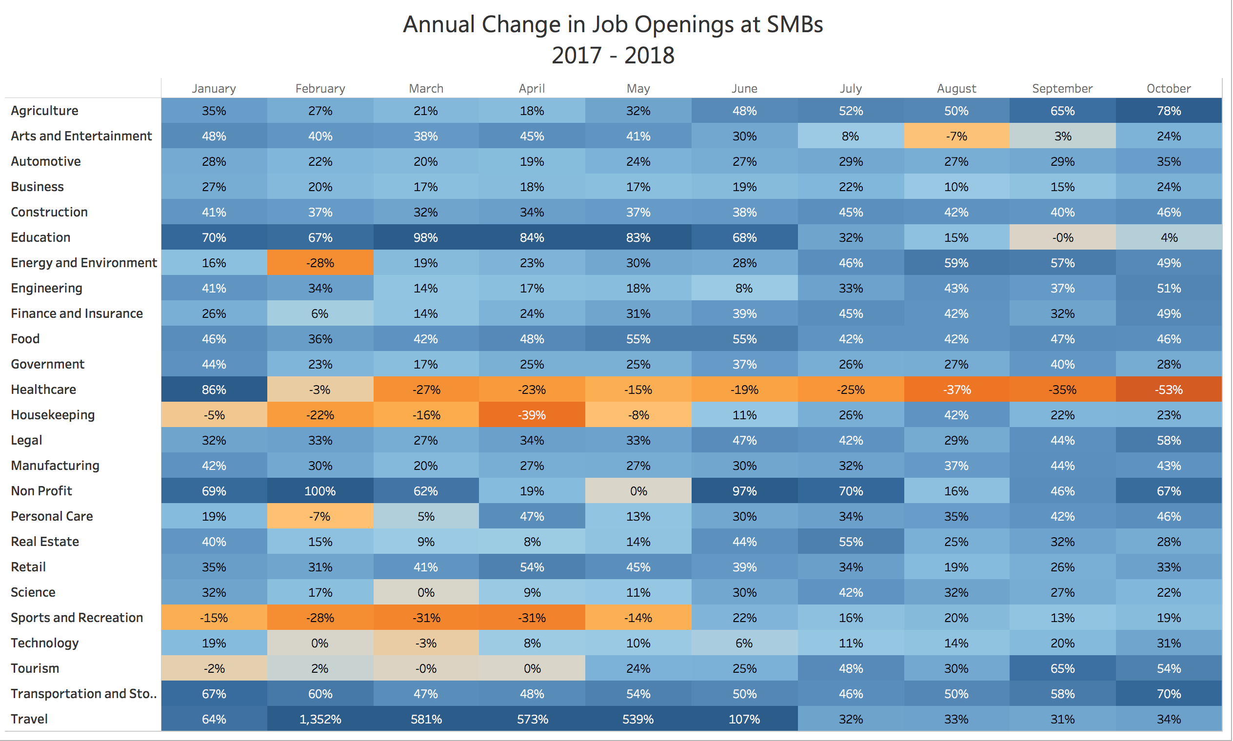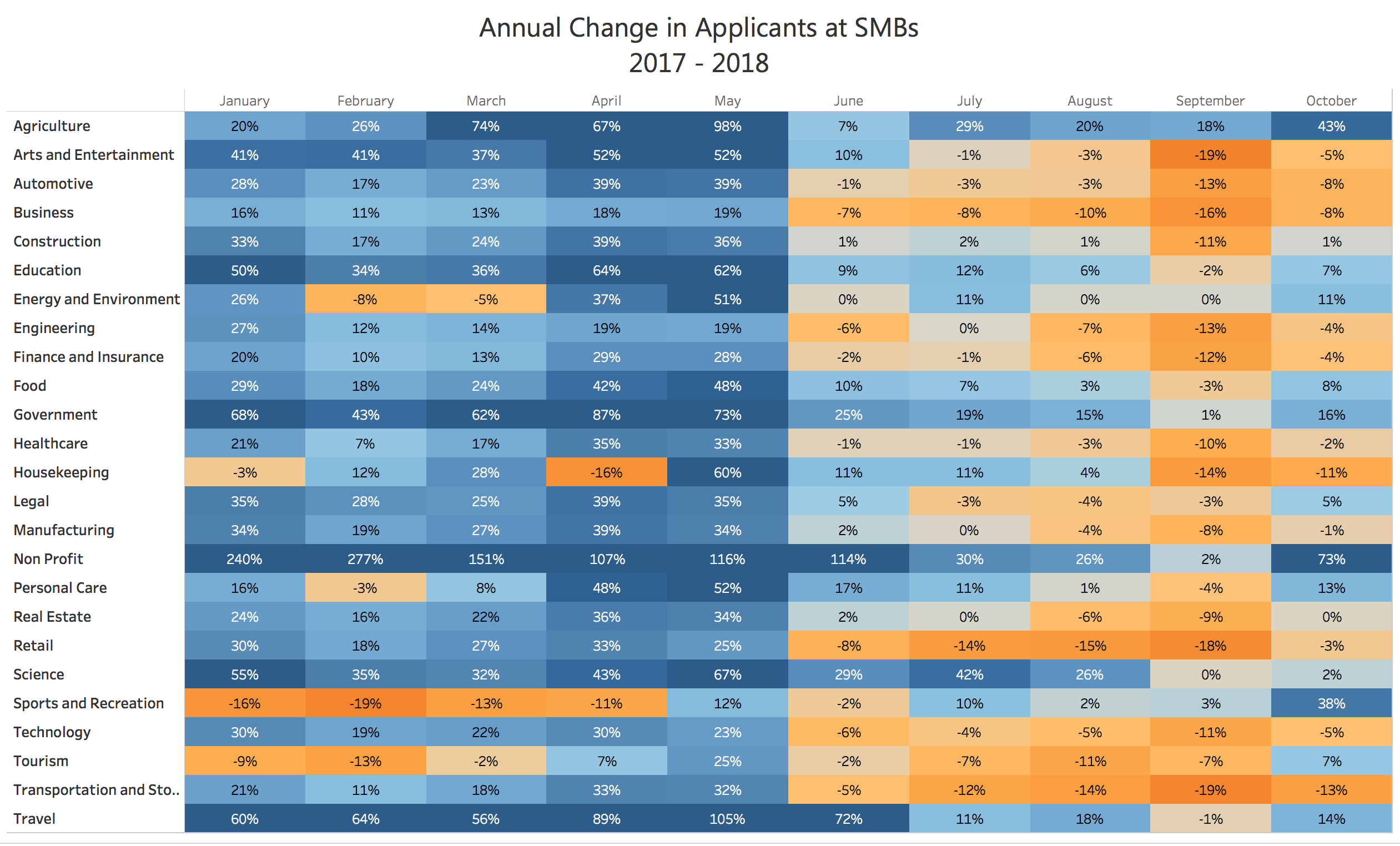 We looked at the annual change in job openings and applicants to SMBs in every industry each month and found that by-and-large SMBs continued to show robust job growth over time, as one might expect given the health of the economy. This is clear at glance from the vast amount of blue painting the job openings table, representing year-over-year growth.