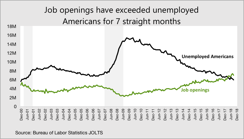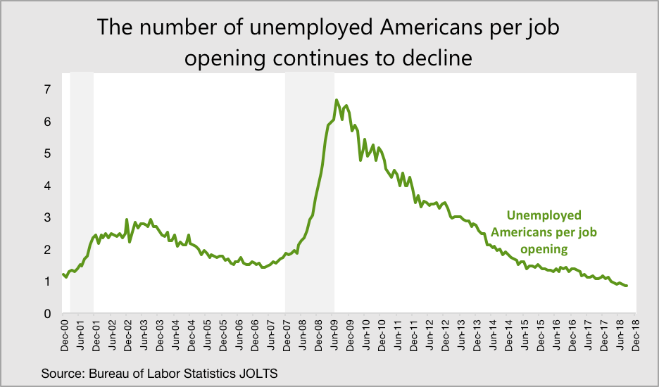 Despite the slight dip in job openings, the number of unemployed Americans per job opening continued to fall. After peaking at 6.4 at the end of the recession in August 2009, it has since fallen to 0.85.
