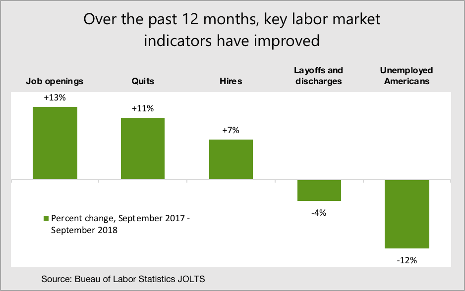 Since September 2017, many key labor market indicators have moved in the right direction. Job openings have increased 13% year-over-year, quits have increased 11%, and hires by 7%. Meanwhile, layoffs and discharges have decreased by 4% and the number of unemployed Americans has fallen by 12%.