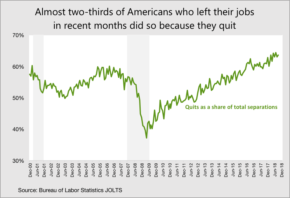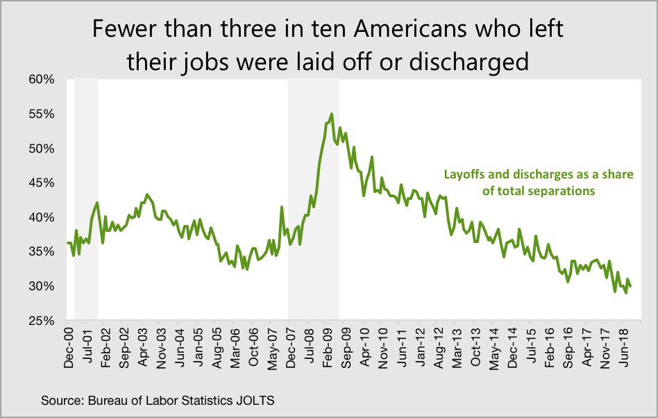 More than half of all Americans who left their jobs in early 2009 did so because they were laid off or discharged. In September 2018, fewer than three in ten Americans departing their jobs did so for those reasons.