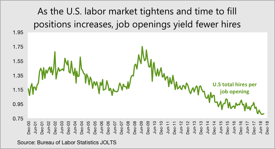 While the JOLTS report contains much good news for workers, some of the data point to challenges for employers. Several recent surveys show that the time it takes for employers to fill positions is rising as the labor market tightens. As a result, the number of completed hires per job opening each month is falling.