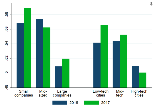 The analyses showing that small companies and low tech-intensive cities are leading the growth in new collar postings are unchanged if we use job title fixed effects (or dummy variables) to look only at posting characteristics within a particular job title, accounting for the possibility that different companies and cities are hiring for different types of positions. This isn’t driving our results.