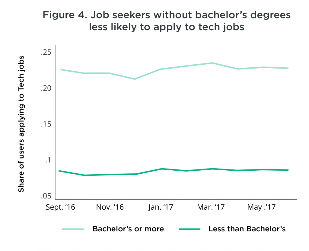 Figure 4 shows the wide divide in behavior between job seekers with bachelor’s degrees and those without. Job seekers with bachelor’s degrees are over three times more likely to apply to tech jobs than job seekers without bachelor’s degrees. Despite the increase in tech postings aimed at attracting new collar workers, the rate at which these people apply to jobs has remained flat. In fact, job seekers with 4-year degrees applied to even more tech jobs after November 2016, widening the application divide between degree-holding and non-degree-holding job seekers.