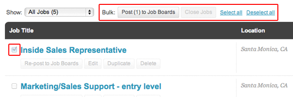 On the My Jobs homepage, we have just added some bulk job actions to make it easier to manage a large list of jobs. After checking the checkbox to the left of the jobs you want to manage, use the buttons that will appear above the job list. From here you can Post, Re-post, and Close multiple jobs with a single click!