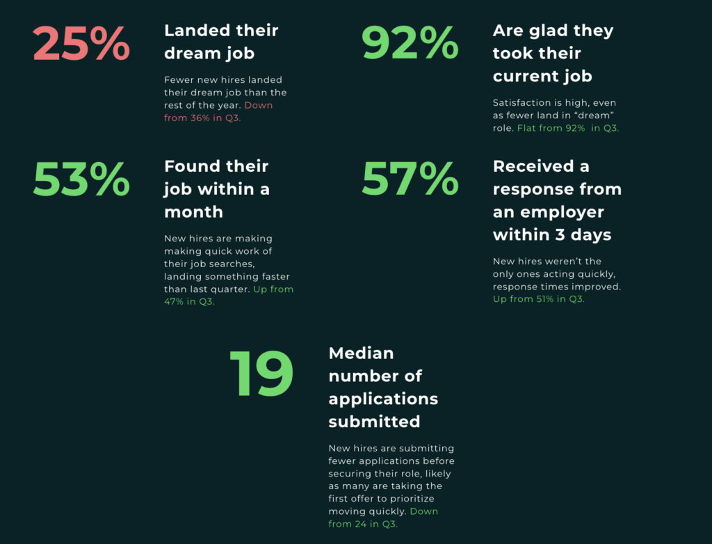 Despite wage pressures, most new hires are satisfied with their new roles. An overwhelming 92% report being happy they took their current job, essentially unchanged from 91.5% in Q3. And 69.2% say they have not experienced “new job regret”. But far fewer new hires claim to have landed their dream job in Q4 at only 25.2%, down from 36.2% in Q3. This gap highlights a shift in worker psychology: candidates are finding satisfaction in stability, culture, and immediate needs rather than holding out for a perception of perfection.