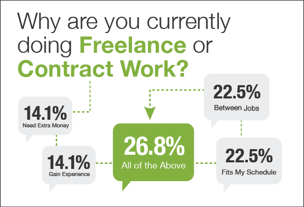 Although the perception of freelancing might be as a supplement or back up, according to our survey Elijiah’s full time work makes him the more typical freelancer. 85 percent of job seekers with a 1099 job said it was the only work they did, and 65 percent reported it as their only source of income. When asked why the chose this type of work, a majority of job seekers said it was either because it worked great with their schedule, or because they were in between permanent jobs.