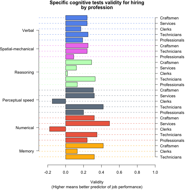 Specific cognitive abilities have long been demoted as not adding any prediction to job satisfaction or performance beyond general intelligence. However, there are exceptions and some reason for resurgence. Perceptual speed and spatial abilities are demonstrated to be important specific cognitive abilities for some jobs, but some are advocating including memory tests. For example, context memory predicts performance in job training well,17 and verbal memory is less affected by age to avoid adversely impacting older applicants.18 A meta-analysis of studies on specific cognitive abilities has highlighted which abilities appear to be the best predictors for different types of jobs (see Figure).19